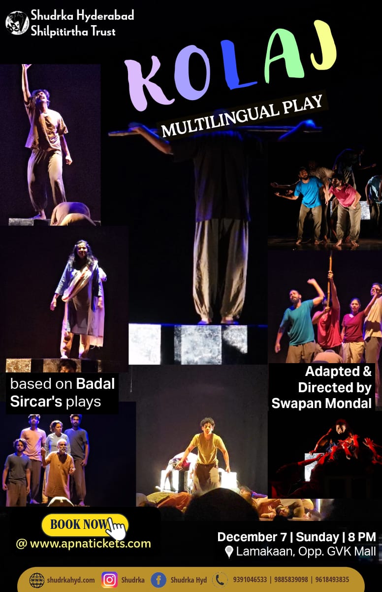 KOLAJ, curated and directed by Swapan Mondal, is a dynamic, multilingual mosaic that pays homage to the timeless voice of Badal Sircar. Seamlessly blending excerpts from Spartacus, Udyogporbo, Pagla Ghora, Micchil, Bhoma and Khat Mat Kring, this performance brings together the emotional depth, political urgency, and theatrical innovation that defined Sircar’s work.