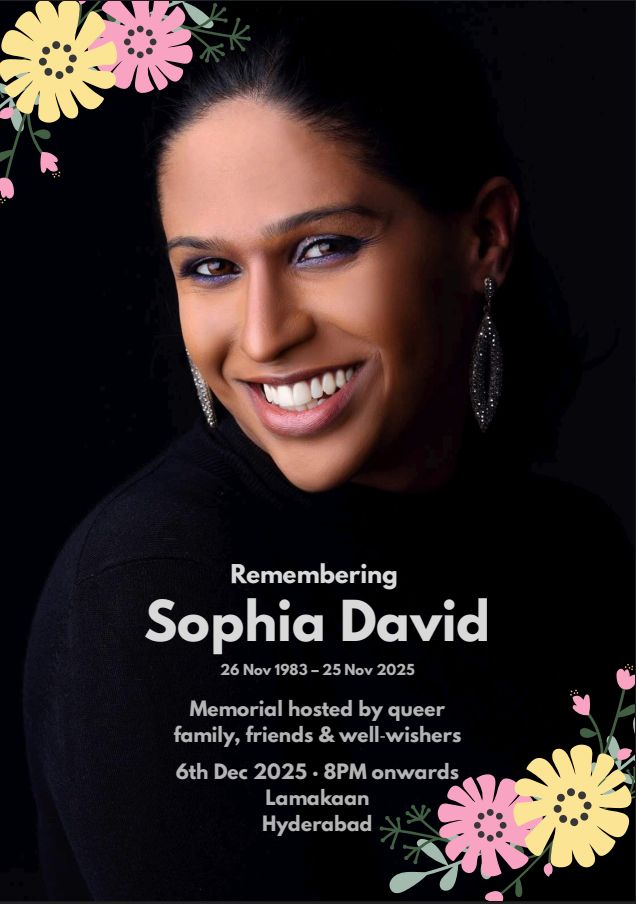 In memory of Sophia David, her friends and well‑wishers are hosting a memorial gathering to honor her life, courage, and legacy. Please join us on 6th December 2025, from 8PM onwards at Lamakaan, Hyderabad as we come together in remembrance, solidarity, and love. Let us celebrate Sophia for who she truly was and carry forward the light she gave to so many.