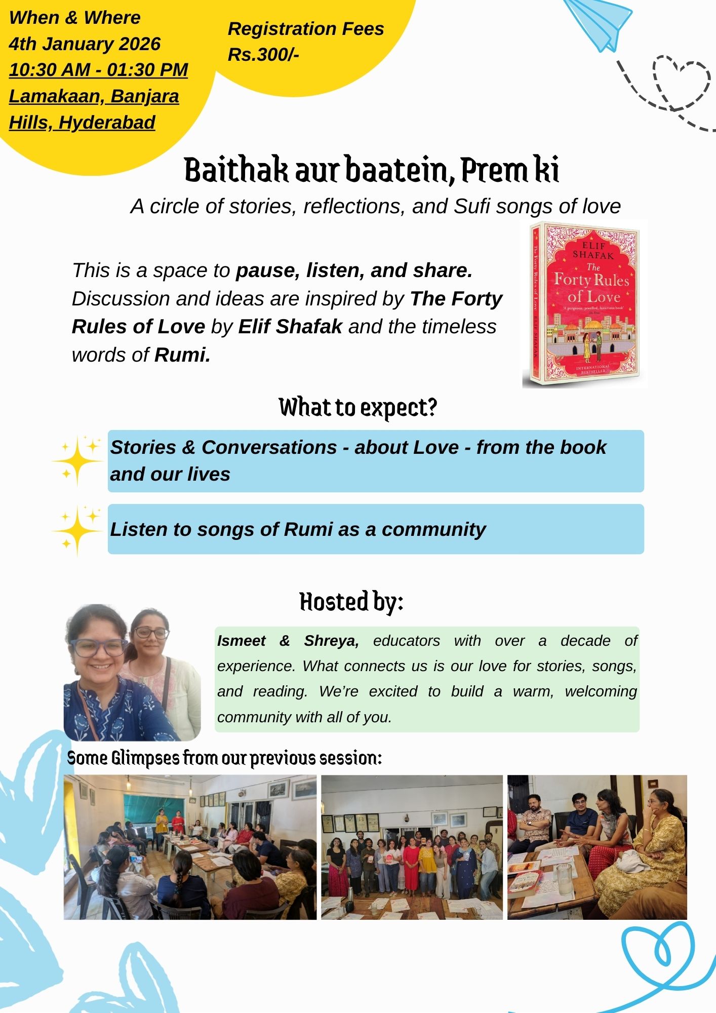 A circle of stories, reflections, and song Love has many forms — gentle, fiery, divine, human. Inspired by The Forty Rules of Love by Elif Shafak and the timeless words of Rumi, this baithak is a space to pause, listen, and share. Together, we will reflect on love through: ✨ Stories from the book and our own lives ✨ Baatein (conversations) on what love means to us in its many shades ✨ Anubhav (experiences) of holding love in community ✨ A closing song in Farsi — a gift from Rumi’s verses This gathering is not a lecture, but a collective holding — a chance to sit in circle, share from the heart, and let all of us find a community to hold and share our experiences of love.