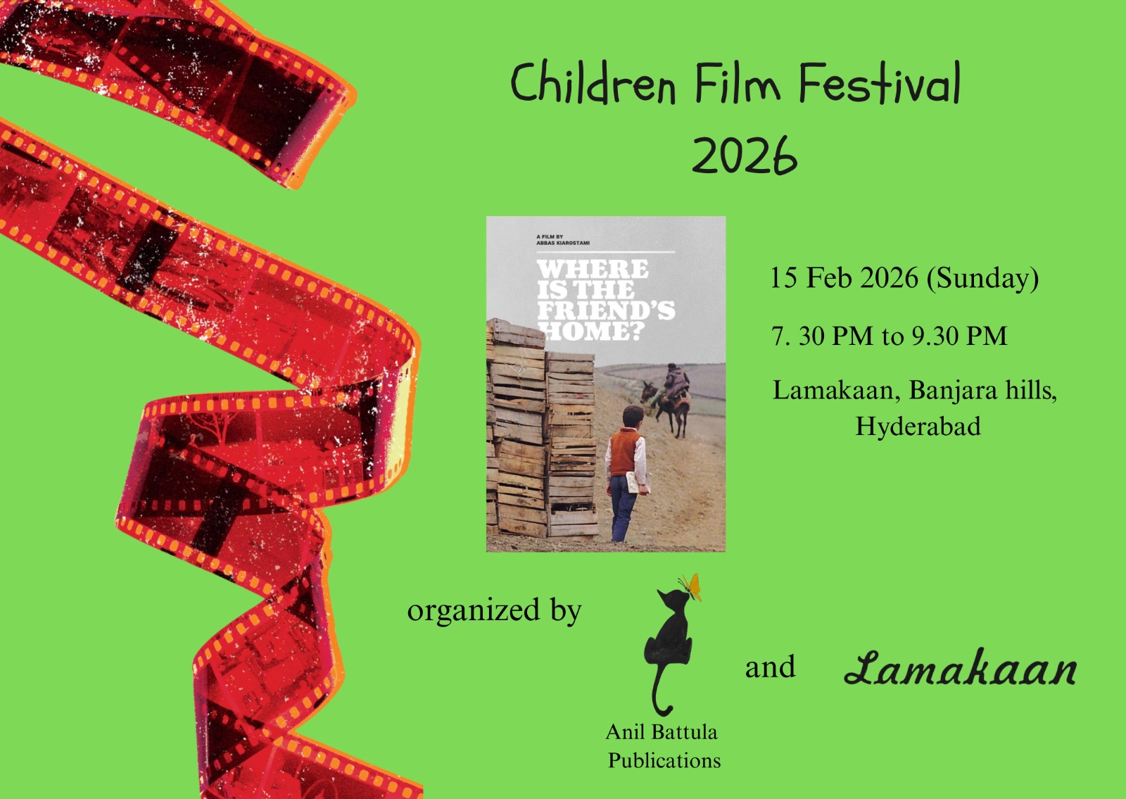 అనిల్ బత్తుల పబ్లికేషన్స్, లమాకాన్ కలిసి నిర్వహిస్తున్న ' పిల్లల సినిమా పండగ 2026 ' లో భాగంగా 15 ఫిబ్రవరి 2026.. ఆదివారం సాయంత్రం 7: 30 నిం లకు ఇరానియన్ పిల్లల సినిమా 'WHERE IS MY FRIENDS HOUSE / HOME? ' ను మీరు బంజారాహిల్స్ (జి.వి.కె వన్ మాల్ ఎదురుస్ సందు) లమాకాన్లో ఉచితంగా చూడవచ్చు. ఈ గొప్ప సినిమాను ప్రపంచ ప్రఖ్యాత దర్శకుడు అబ్బాస్ కియరొస్తమీ తీశారు. ఈ గొప్ప అనుభవాన్ని మిస్ కాకండి. అందరికీ సాదర ఆహ్వానం.