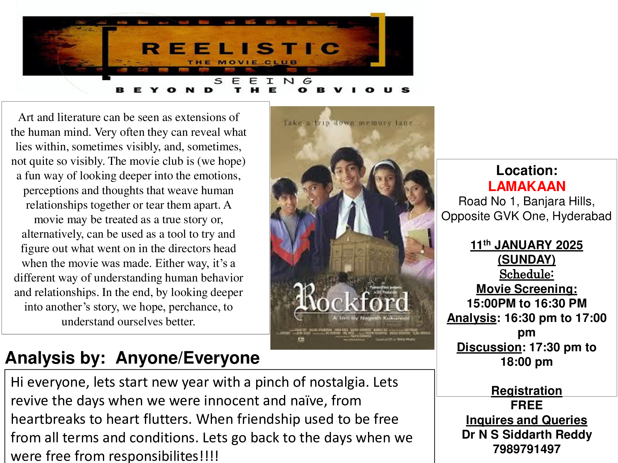Art and literature can be seen as extensions of the human mind. Very often they can reveal what lies within, sometimes visibly, and, sometimes, not quite so visibly. The movie club is (we hope) a fun way of looking deeper into the emotions, perceptions and thoughts that weave human relationships together or tear them apart. A movie may be treated as a true story or, alternatively, can be used as a tool to try and figure out what went on in the directors head when the movie was made. Either way, it’s a different way of understanding human behavior and relationships. In the end, by looking deeper into another’s story, we hope, perchance, to understand ourselves better.