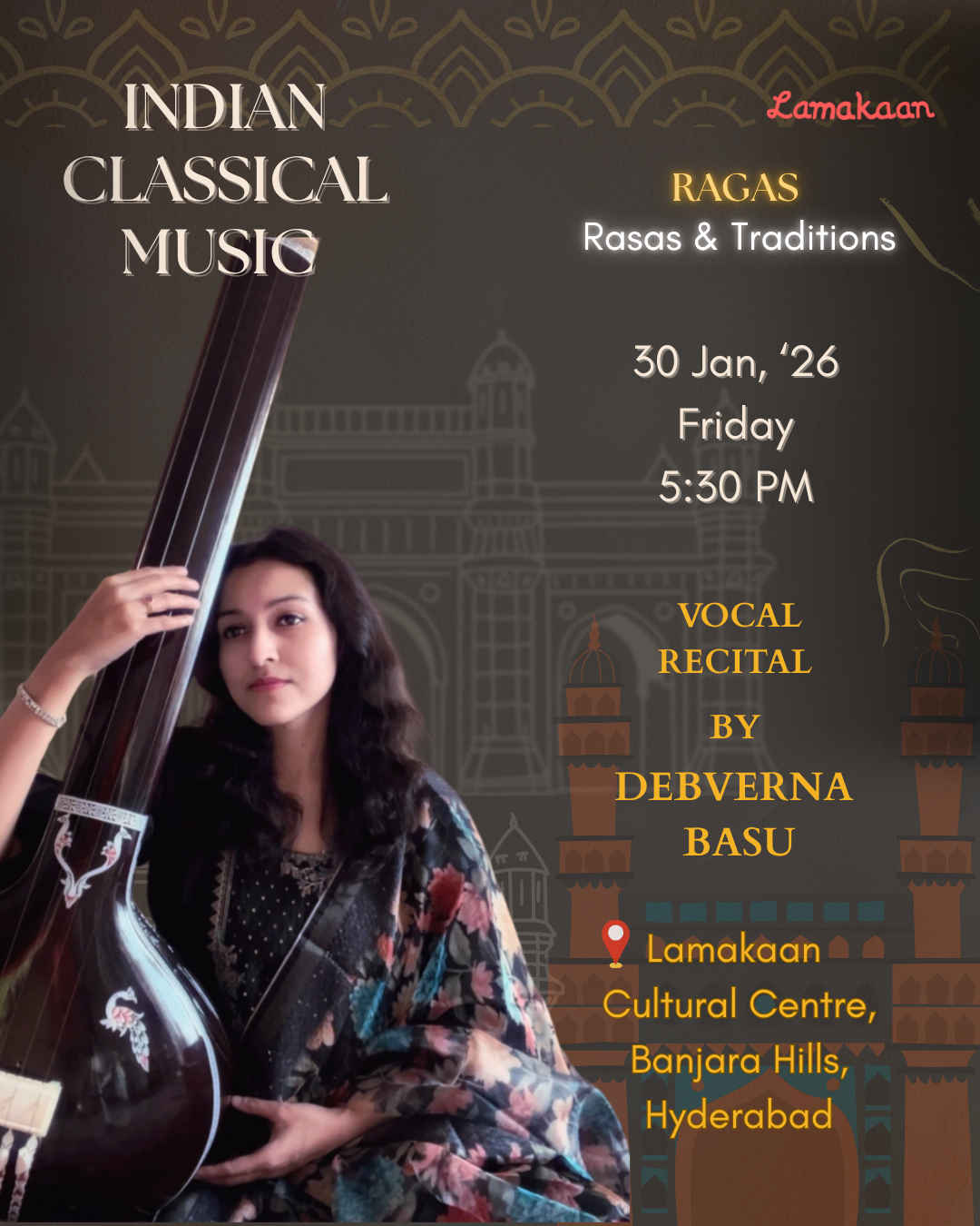Debverna, a vocalist and composer, has over a decade of experience as a performing artist. A recognized All India Radio artist, with a Doctorate in Indian Classical Music, Debverna is a master of her craft belonging to the Jaipur and Gwalior Gharana traditions, learning from Pt. Nishad Bakre, Vidushi Arati Ankalikar and Pt. Ulhas Kashalkar. Her performances are emotional journeys, skillfully executed, that takes the audience on a deep dive into the soul of each raga. Do not miss this captivating artist performing this Friday evening at Lamakaan where she takes you into the world of the ragas performed in the light of the sangeet shastras.
