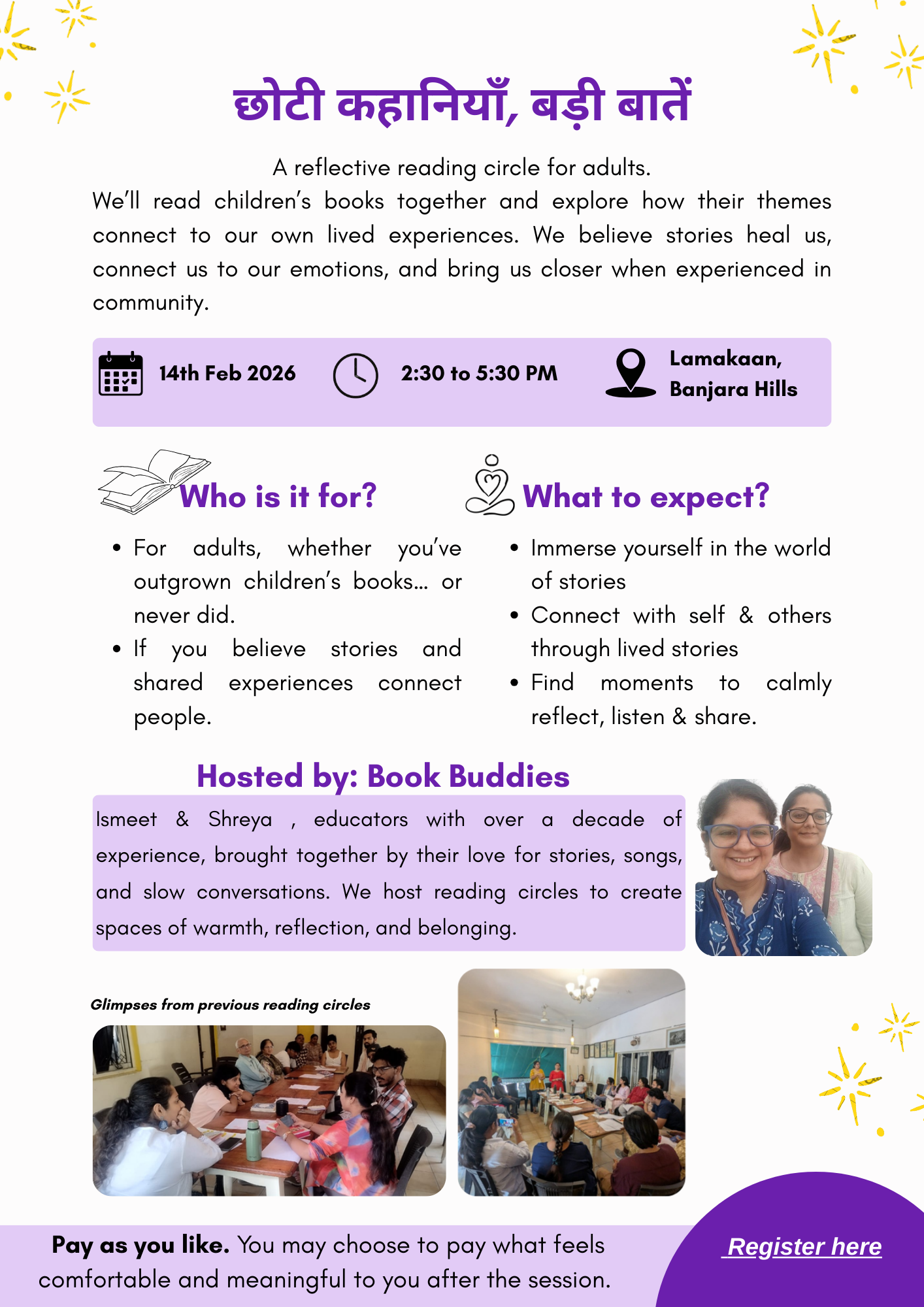We’ll read children’s books together and explore how their themes connect to our own lived experiences. We believe stories heal us, connect us to our emotions, and bring us closer when experienced in community.