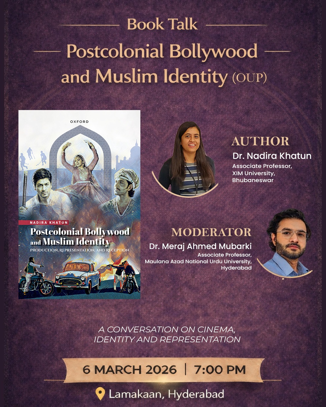 The book talk will be delivered by Dr. Nadira Khatun, Author and Associate Professor at XIM University Bhubaneswar. Her research focuses on media, nationalism, memory, and minority representation in South Asian cinema. She has published widely on Bollywood and identity politics, and her work bridges film studies, political theory, and postcolonial scholarship.