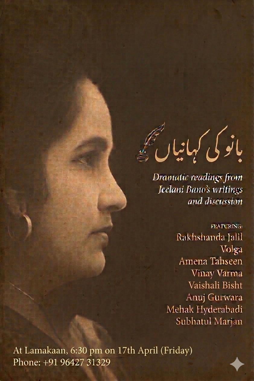 Join us for Bano Ki Kahaniyan, an evening celebrating the extraordinary literary legacy of Jeelani Bano — the Padma Shri-awarded Hyderabadi writer whose stories gave voice to the struggles, dignity, and quiet strength of ordinary lives across seven decades. Through dramatic readings and discussion, nine distinguished voices — including Rakhshanda Jalil, Volga, Amena Tahseen, Vinay Varma, Vaishali Bisht, Anuj Guwara, Mehak Hyderabadi and Subhatul Marjan — will bring her unforgettable prose to life and discuss her works. At Lamakaan, Friday, 17th April, 6:30 PM. All are welcome.