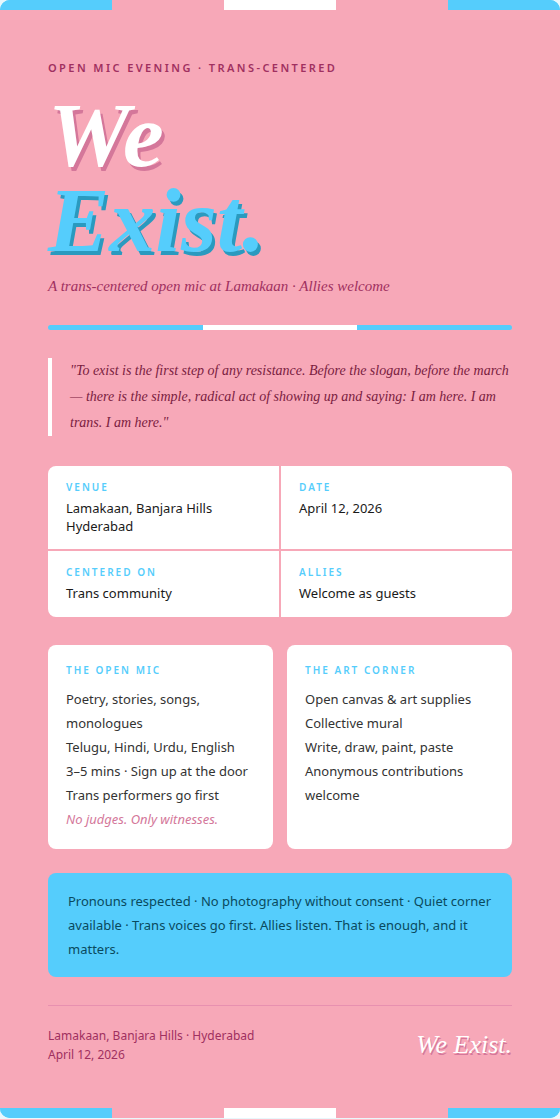 We Exist is a gathering built on presence itself. In a moment when trans lives are increasingly legislated, erased, or debated without us in the room — we make a room of our own. No debate. No justification. Just being, together, out loud.