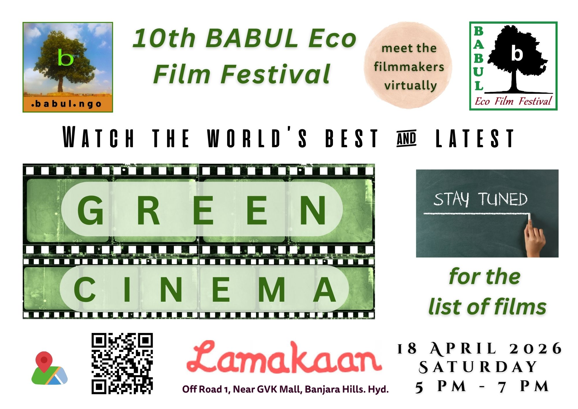 Event Page «Prev From Apr 25, '26 to May 25, '26 Next» 10495 Green Films screening by Babul Thu May 7, 5:30 PM Babul Films Soceity Babul ngo spreads Environmental Awareness using Cinema. BEFF Babul Eco Film Festival is their flagship event. Presently BEFF 10th edition (2026) is happening.