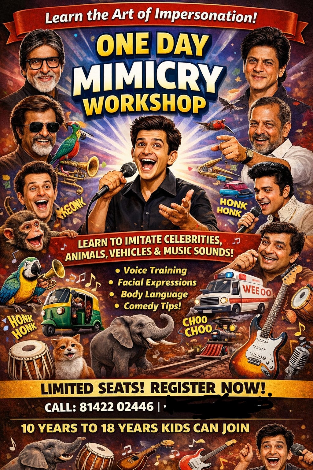 A one-day workshop on Mimicry will be conducted by Record holder, Mr. Srinivas on 2nd May 2026 at Lamakaan, from 10.30 am to 2.00 pm.